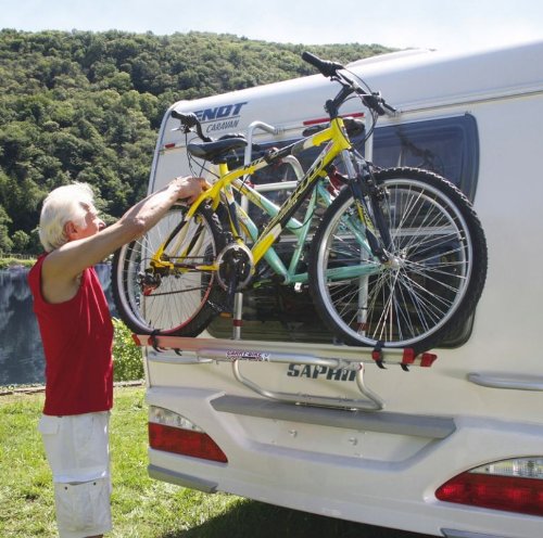 Der Fahrradträger wird auf die verstärkten vorhandenen Befestigungspunkte der Wände angebracht. Die obere Halterung wird in die vorhandene Schiene über dem Heckfenster befestigt. Die untere Halterung wird auf die verstärkten unteren Punkte angebracht. Passend für Wohnwagen mit schiefer und schwacher Heckwand. Maximale Tragkraft 35 kg Eigengewicht 6,4 kgStandardmäßigfür Fahrräder 2 ausgestattet mit 1 + 2 Bike Block Pro/Rail Quick